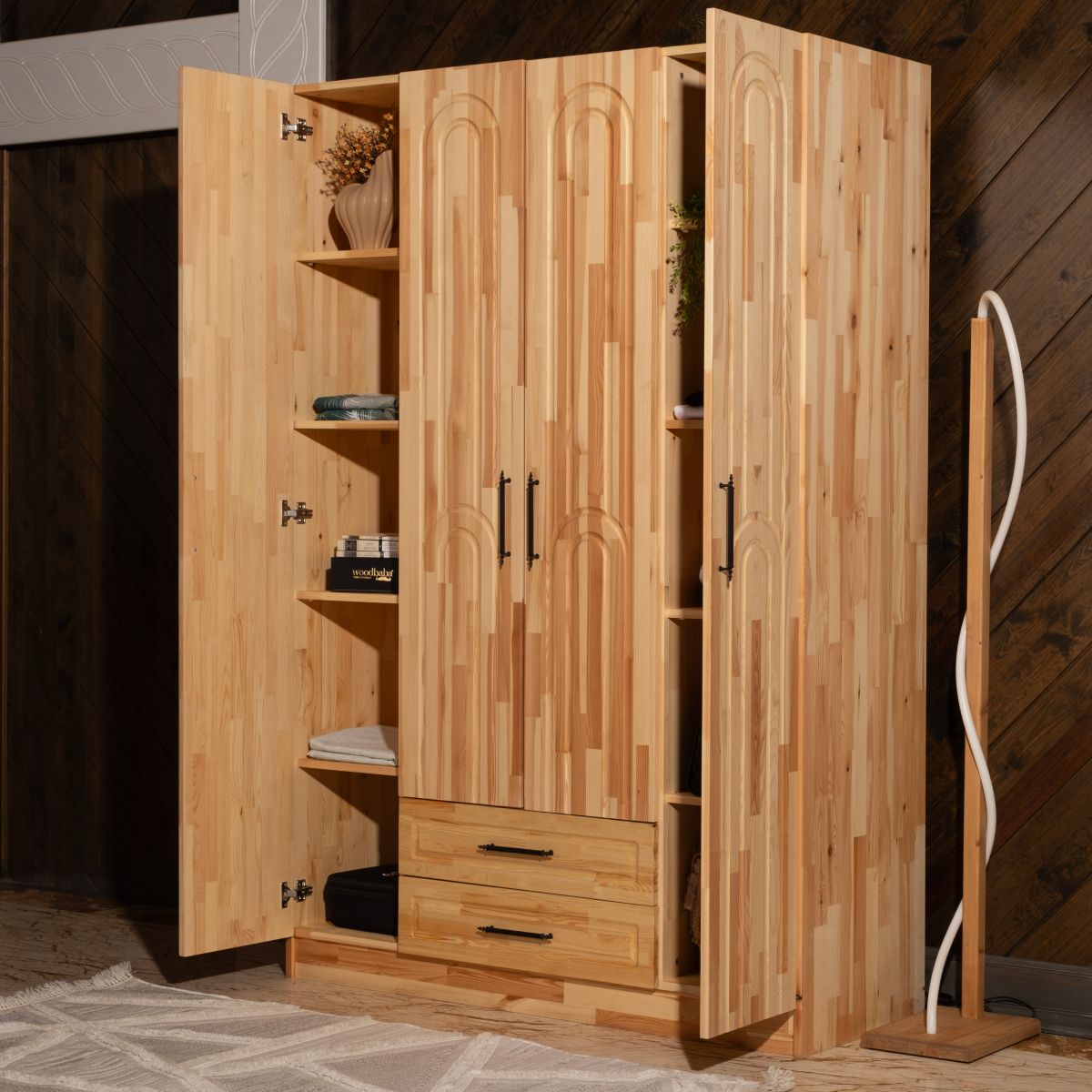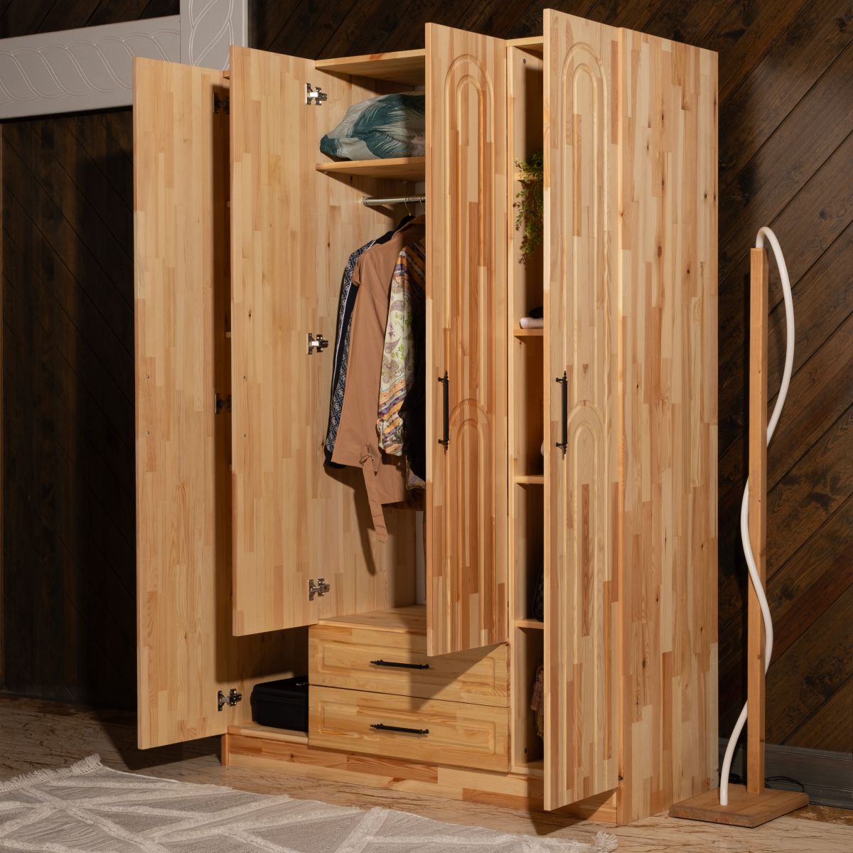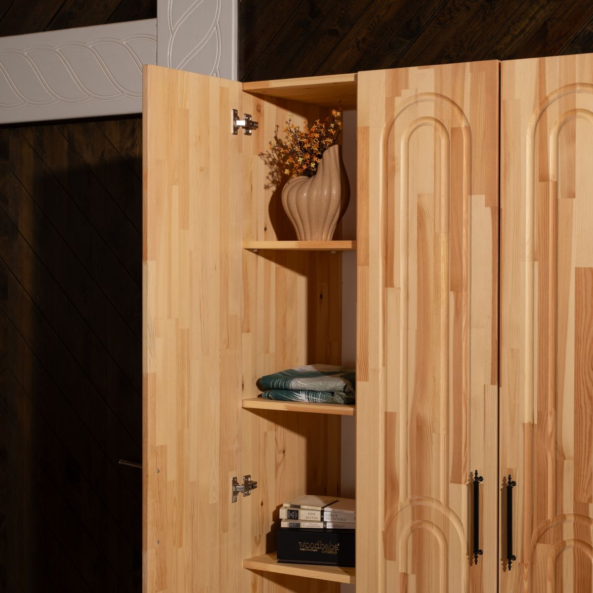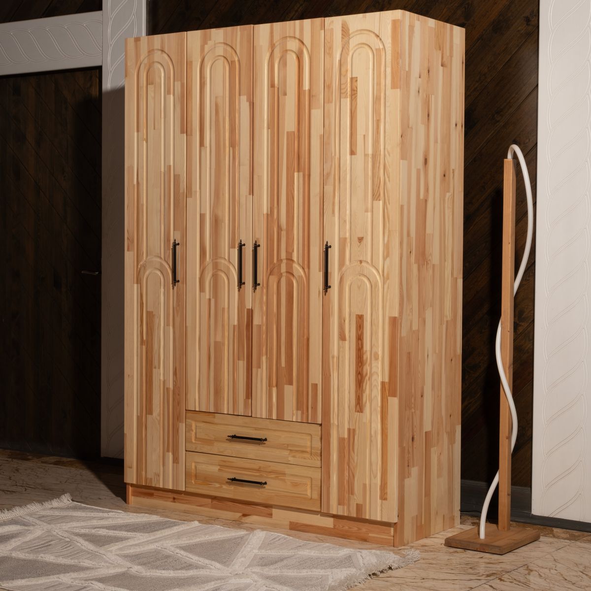 Zarif Çizgiler, Modern Tasarım Bohem 4 Kapaklı Oval Çizgili Doğal Ahşap Gardırop, estetik oval hatları ve dekoratif yüzey çizgileriyle yatak odanıza modern bir karakter katar. Doğal ahşap rengi, yaşam alanınıza sıcak ve şık bir atmosfer kazandırırken, kapak tasarımıyla sıradan gardıroplardan ayrılır. %100 doğal ahşap gövde, İtalyan menşeli Borma Wachs sertifikalı yağ ile korunmuş olup, insan sağlığına zararsızdır. Dıştan 54 cm, net içten 50 cm derinlik ölçüsü sayesinde elbiselerinizi rahatça asabileceğiniz geniş bir kullanım alanı sunar.