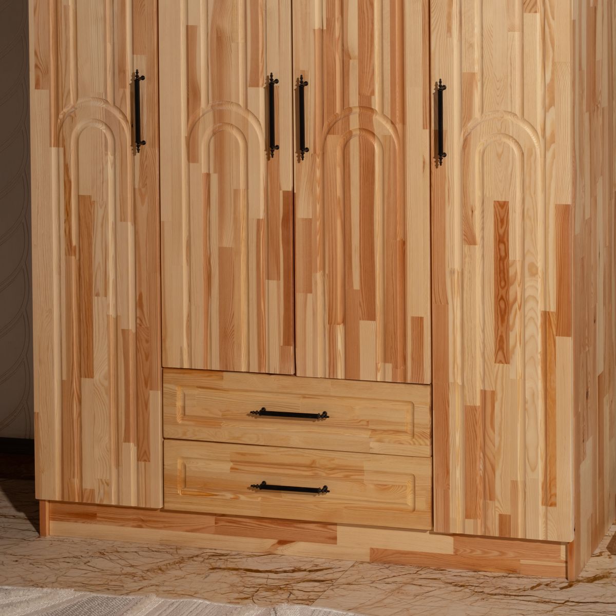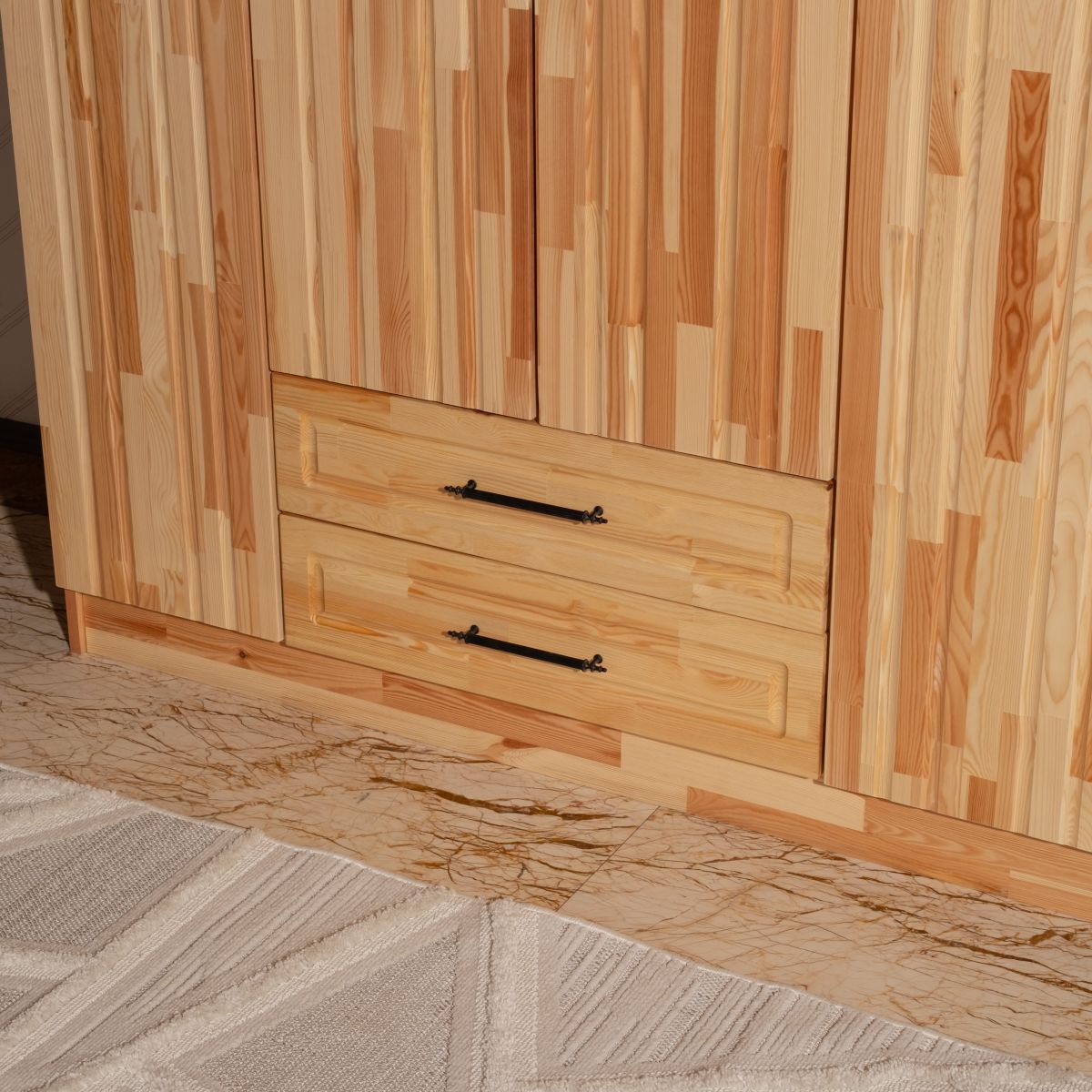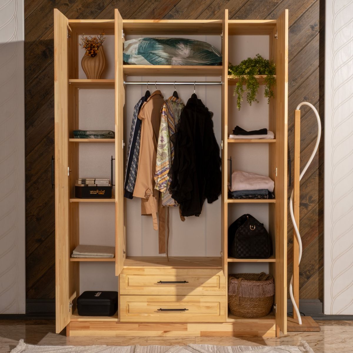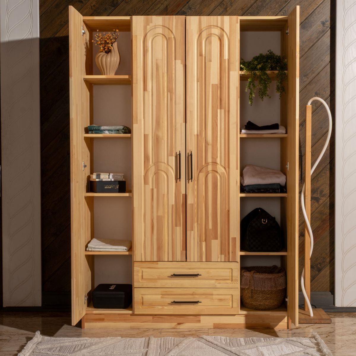 Zarif Çizgiler, Modern Tasarım Bohem 4 Kapaklı Oval Çizgili Doğal Ahşap Gardırop, estetik oval hatları ve dekoratif yüzey çizgileriyle yatak odanıza modern bir karakter katar. Doğal ahşap rengi, yaşam alanınıza sıcak ve şık bir atmosfer kazandırırken, kapak tasarımıyla sıradan gardıroplardan ayrılır. %100 doğal ahşap gövde, İtalyan menşeli Borma Wachs sertifikalı yağ ile korunmuş olup, insan sağlığına zararsızdır. Dıştan 54 cm, net içten 50 cm derinlik ölçüsü sayesinde elbiselerinizi rahatça asabileceğiniz geniş bir kullanım alanı sunar.