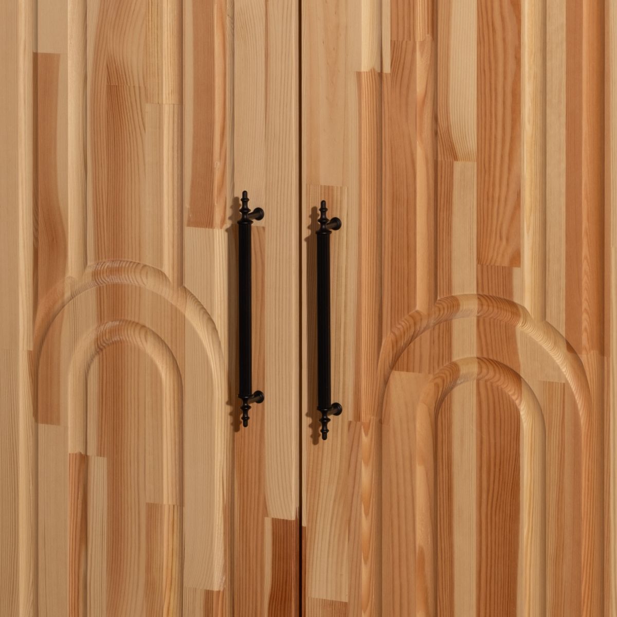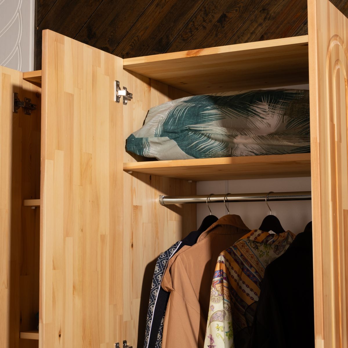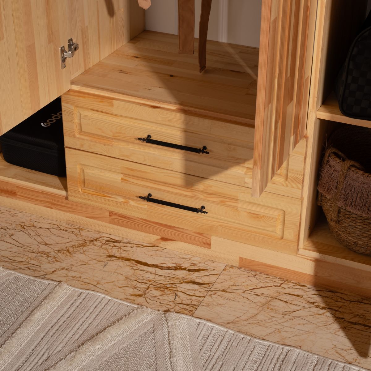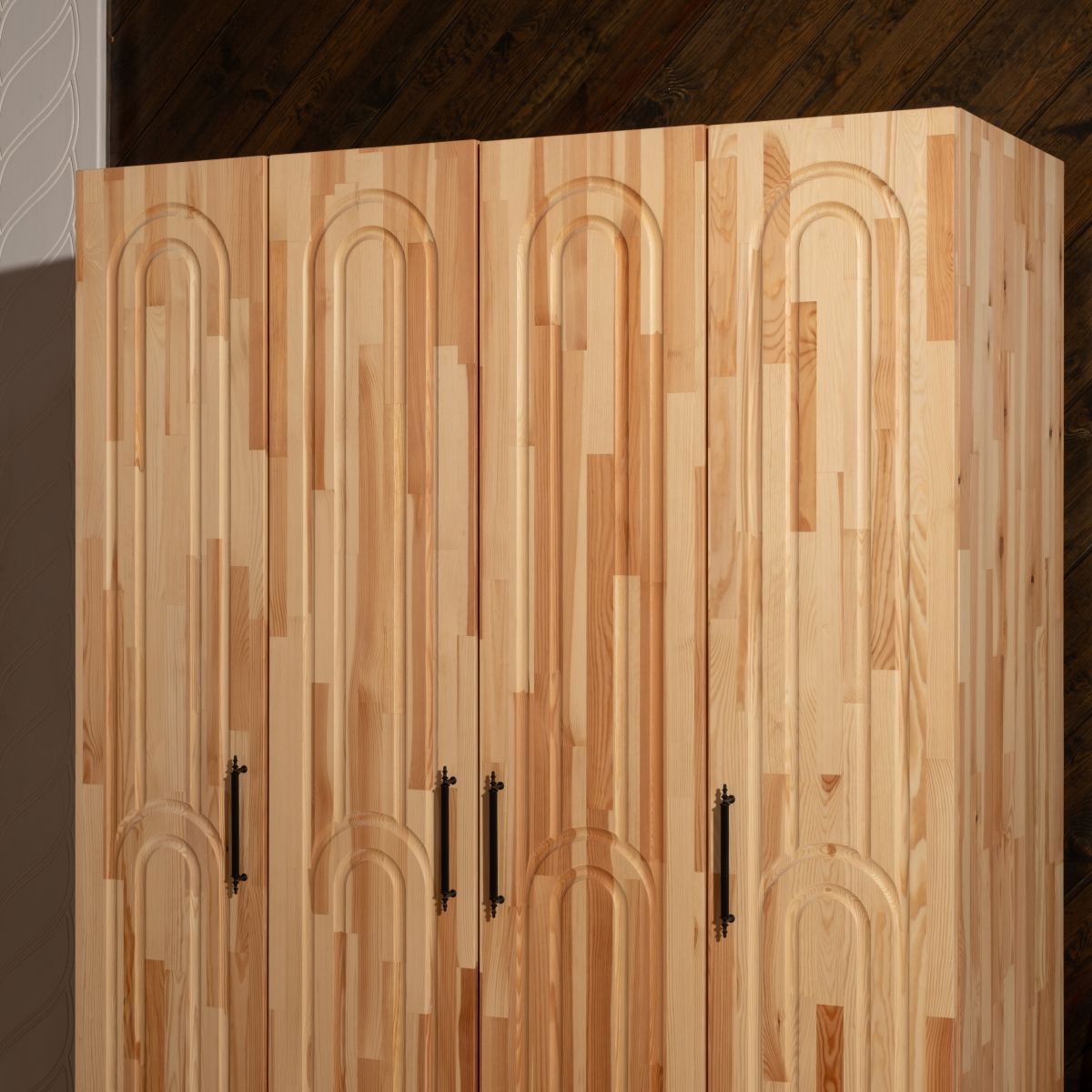 Zarif Çizgiler, Modern Tasarım Bohem 4 Kapaklı Oval Çizgili Doğal Ahşap Gardırop, estetik oval hatları ve dekoratif yüzey çizgileriyle yatak odanıza modern bir karakter katar. Doğal ahşap rengi, yaşam alanınıza sıcak ve şık bir atmosfer kazandırırken, kapak tasarımıyla sıradan gardıroplardan ayrılır. %100 doğal ahşap gövde, İtalyan menşeli Borma Wachs sertifikalı yağ ile korunmuş olup, insan sağlığına zararsızdır. Dıştan 54 cm, net içten 50 cm derinlik ölçüsü sayesinde elbiselerinizi rahatça asabileceğiniz geniş bir kullanım alanı sunar.